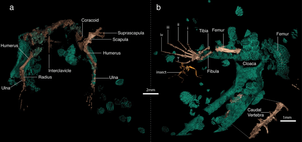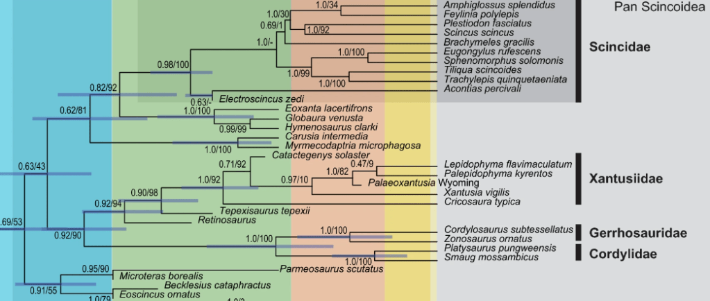 Référence : Daza, J.D.; Stanley, E.L.; Heinicke, M.P.; Leah, C.; Doucet, D.S.; Fenner, K.L.; Arias, J.S.; Smith, R.D.A.; Peretti, A.M.; Aung, N.N.; Bauer, A.M., 2024, Compound osteoderms preserved in amber reveal the oldest known skink. Scientific Reports. 14: 15662.
