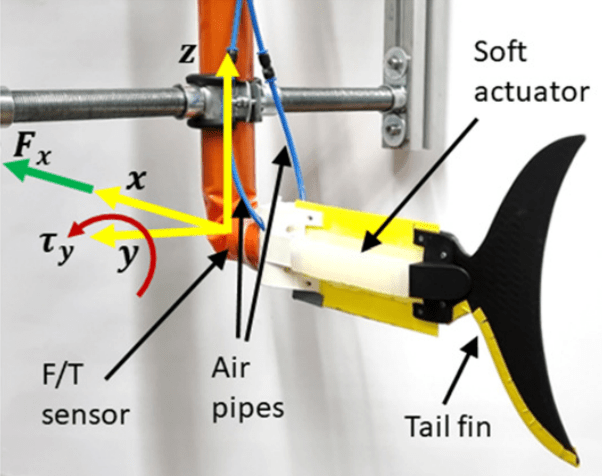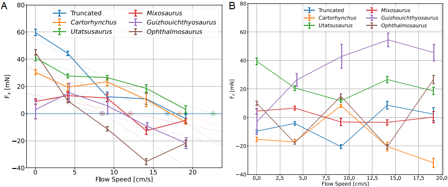 Sprumont et ses collègues ont donc analysé la biomécanique de la queue de Cartorhynchus, d’Utatsusaurus, de Mixosaurus, de Guizhouichthyosaurus et d’Ophthalmosaurus. Pour ce faire, ils ont fabriqué des modèles réduits de leurs queues afin de les soumettre à différentes conditions de nage. Sprumont et ses collègues ont ainsi utilisé ces robots-nageoires caudales afin de calculer la force de poussée et l’équilibre des forces mises en jeu par la queue de ces 5 ichthyosauromorphes.