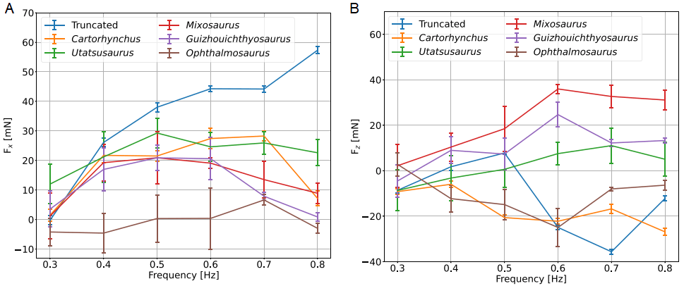 Chez les ichthyosauromorphes, la force de poussée de la queue (notée Fx dans les résultats de Sprumont et ses collègues) est obtenue par l’intéraction physique entre la forme de la queue, la fréquence d’oscillation de la queue et la vitesse d’écoulement de l’eau où ils nagent. Selon les taxons étudiés, la fréquence d’oscillation optimale varie entre 0,5 Hz et 0,7 Hz. A noter que plus la vitesse d’écoulement de l’eau est élevée et plus la force de poussée horizontale de la queue diminue. En revanche, selon la forme de la queue, une augmentation de la poussée verticale de la queue est possible même quand la vitesse d’écoulement de l’eau augmente.