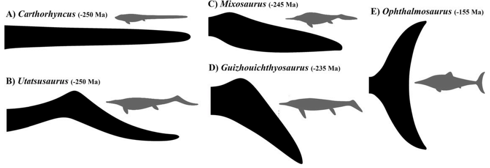 Au contraire, les queues symétriques de Cartorhynchus et d’Ophthalmosaurus avaient une meilleure force de poussée horizontale mais une moins bonne efficacité dans la poussée verticale. La queue en forme de pagaie de Cartorhynchus ne permettait pas de contrebalancer sa flottabilité, ce qui suggère que ce rôle était peut-être assuré par les membres. Ophthalmosaurus est un genre spécialisé dont la morphologie ne générait pas de force ascendante liée à la flottabilité. Par conséquent, sa queue en demi-lune lui conférait une force de poussée considérable lui permettant d’atteindre de grandes vitesses.