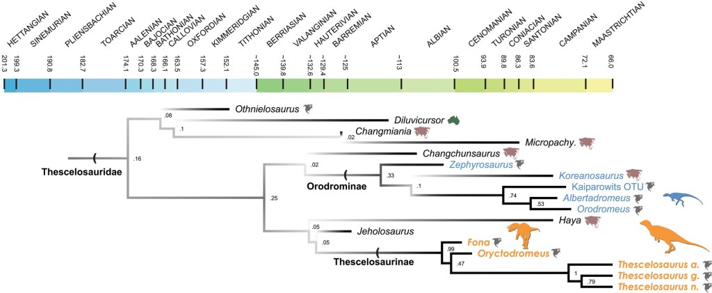 L’analyse phylogénétique d’Avrahami et ses collègues classe Fona au sein de Thescelosauridae, en taxon-soeur d’Oryctodromeus chez les thescelosaurinés. Cette position diffère de celle annoncée dans les articles et conférences précédentes, qui classaient Fona et Oryctodromeus comme des thescelosauridés orodrominés. Le clade formé par Fona et Oryctodromeus est le clade-soeur de Thescelosaurus. Les résultats d’Avrahami et ses collègues confirment que les thescelosaurinés étaient bien présents en Amérique du Nord dès le début du crétacé.