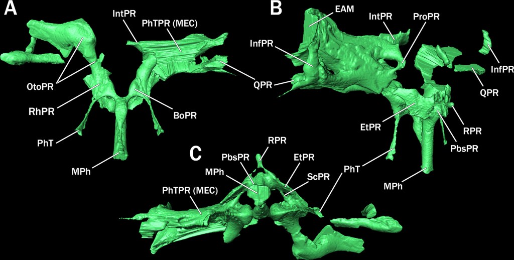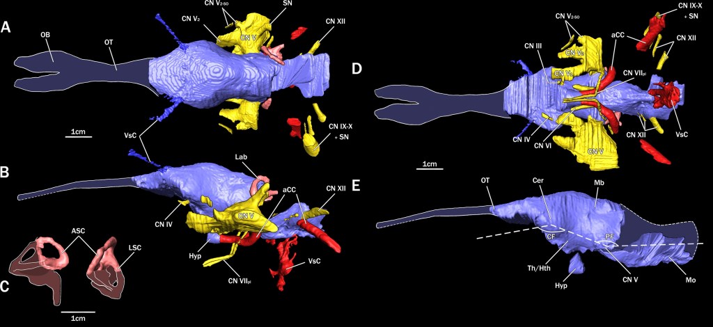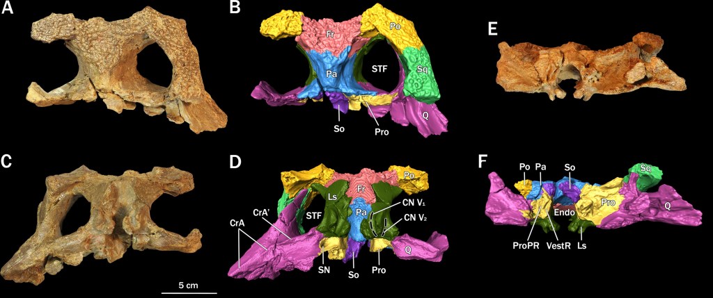 Références : Kuzmin, I.T.; Sichinava, E.A.; Mazur, E.V.; Gombolevskiy, V.A., 2024), Virtual reconstruction of the neurocranial anatomy of Kansajsuchus extensus (Neosuchia: Paralligatoridae) from the Upper Cretaceous of Tadzhikistan with a review of braincase osteology in Neosuchia. Cretaceous Research. 105959.