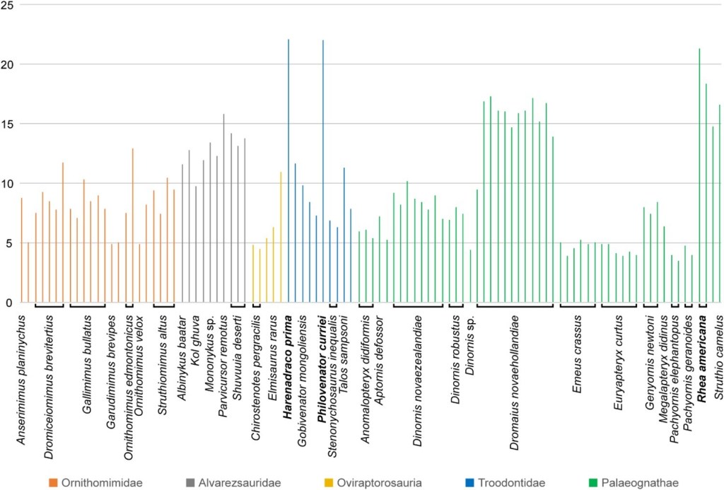 Harenadraco se caractérise par ses tarsométatarsiens extrêmement allongés. Lee et ses collègues ont calculé le ratio longueur/largeur de ses tarsométatarsiens, et ont obtenu des résultats qui dépassent presque tous les autres théropodes. Seul le nandou actuel (Rhea) et le troodontidé Philovenator ont un ratio comparable. Pour Lee et ses collègues, il pourrait s’agir d’une caractéristique liée à la nature juvénile des troodontidés, mais le stade ontogénique de l’holotype (MPC-D 110/119) d’Harenadraco prima est inconnu, ce qui rend cette supposition invérifiable.