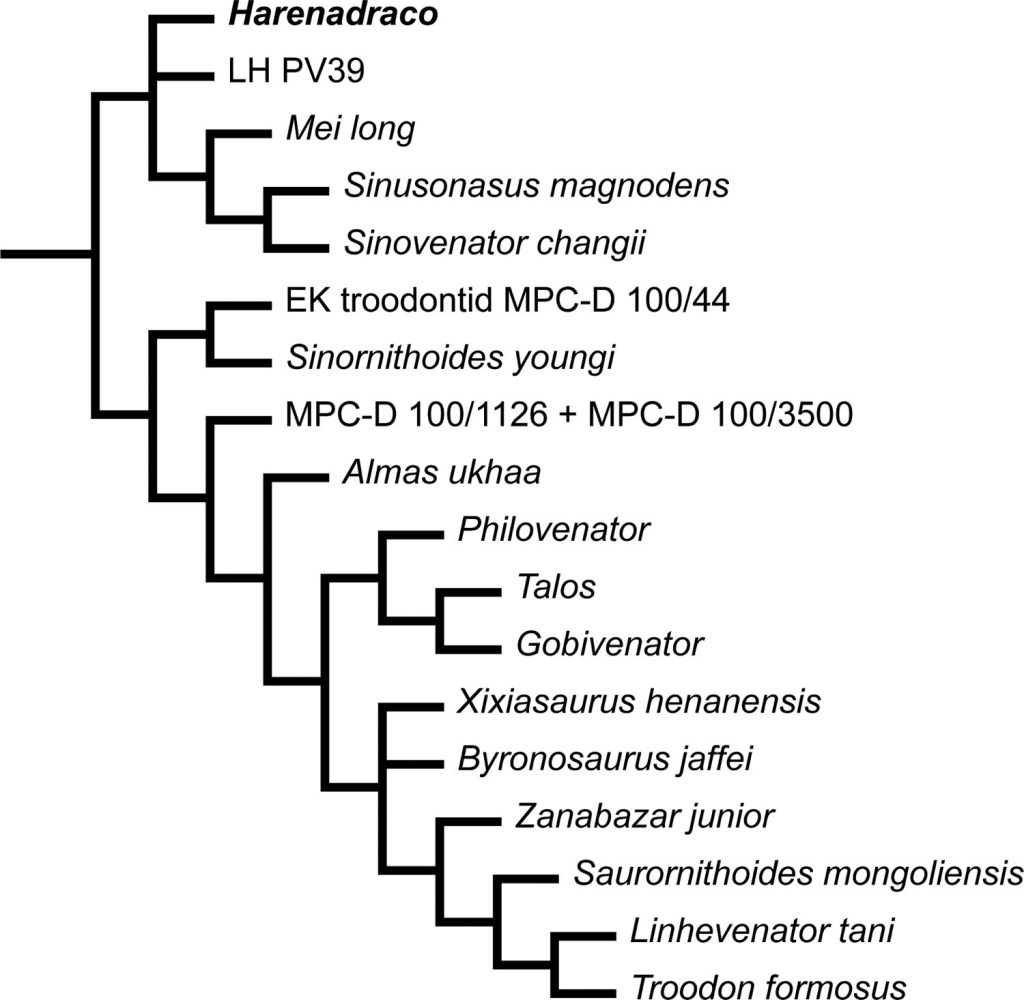 L’analyse phylogénétique de Lee et ses collègues a classé Harenadraco comme un membre basal de Sinovenatorinae chez les troodontidés. A noter que selon leur analyse, la sous-famille Sinovenatorinae est le clade le plus basal de Troodontidae et comprend Mei, Sinusonasus et Sinovenator en plus d’Harenadraco. Ce résultat fait d’Harenadraco l’un des plus jeunes sinovenatorinés connus.