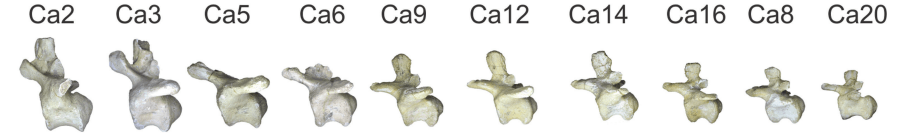 Vidal et ses collègues ont donc analysé la biomécanique des vertèbres de Trigonosaurus sensu lato, c’est à dire de son holotype (MCT 1488-R) et de son supposé paratype (MCT 1719-R). En suivant la taxonomie de Silva Junior et ses collègues, l’analyse de Vidal et ses collègues porte donc sur la biomécanique des vertèbres cervicales et dorsales de Baurutitan et sur celle des vertèbres caudales de Caieiria. Pour effectuer leur analyse, Vidal et ses collègues ont scanné les vertèbres de MCT 1488-R et MCT 1719-R afin de les soumettre à des analyses biomécaniques. Ils ont reconstruit les éléments manquants pour réaliser une reconstitution 3D de toute la colonne vertébrale de Trigonosaurus.