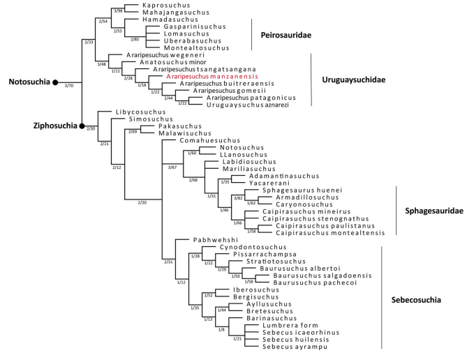 Araripesuchus est un genre de crocodylomorphe notosuchien uruguaysuchidé, connu de 6 espèces valides du crétacé inférieur jusqu’à la fin du crétacé supérieur. A. wegeneri et A. rattoides proviennent du Niger, A. tsangatsangana de Madagascar, A. gomesii du Brésil et A. patagonicus ainsi que A. buitreraensis d’Argentine. En 2021, Fernandez Dumont et ses collègues analysent l’ostéohistologie d’un spécimen assigné à Araripesuchus sp. et découvert dans le Cénomanien de la formation géologique de Candeleros (Rio Negro, Argentine). Fernandez Dumont et ses collègues décrivent ainsi ce spécimen comme l’holotype d’une nouvelle espèce d’Araripesuchus qu’ils baptisent A. manzanensis.