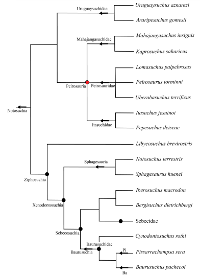 Les notosuchiens sont un groupe de crocodylomorphes connus du jurassique moyen au miocène sur la quasi totalité du globe. Ils se caractérisent par une très grande diversité au niveau de l’écologie alimentaire, avec des formes carnivores, omnivores, végétivores ou encore durophages. Les notosuchiens comprennent notamment les clades Sebecosuchia, Baurusuchidae, Sphagesauria, Peirosauridae ainsi que plusieurs autres familles plus petites. Un travail de nomenclature phylogénétique suivant le PhyloCode a déjà été effectué pour certains de ces clades, mais pas la totalité. Leardi et ses collègues réalisent ainsi ce travail de nomenclature, et érigent le nouveau clade Peirosauria.