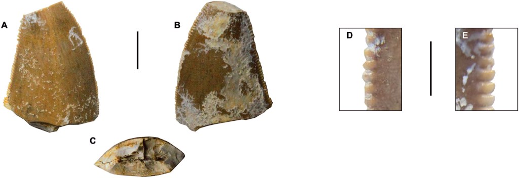 Référence : Candeiro, C.R.A.; Ribeiro, T.B.; Paula, T.A.; Pereira, P.V.L.G.C.; Vidal, L.; Gil, L.M.; Dias, T.; Gonzalez-Riga, B.; Brusatte, S.L.; Carabajal, A.P., 2024, Isolated theropod teeth from the Upper Cretaceous of Goias State (Brazil): northernmost occurrence of Abelisauridae from the Bauru Basin. Journal of South American Earth Sciences. 105075.