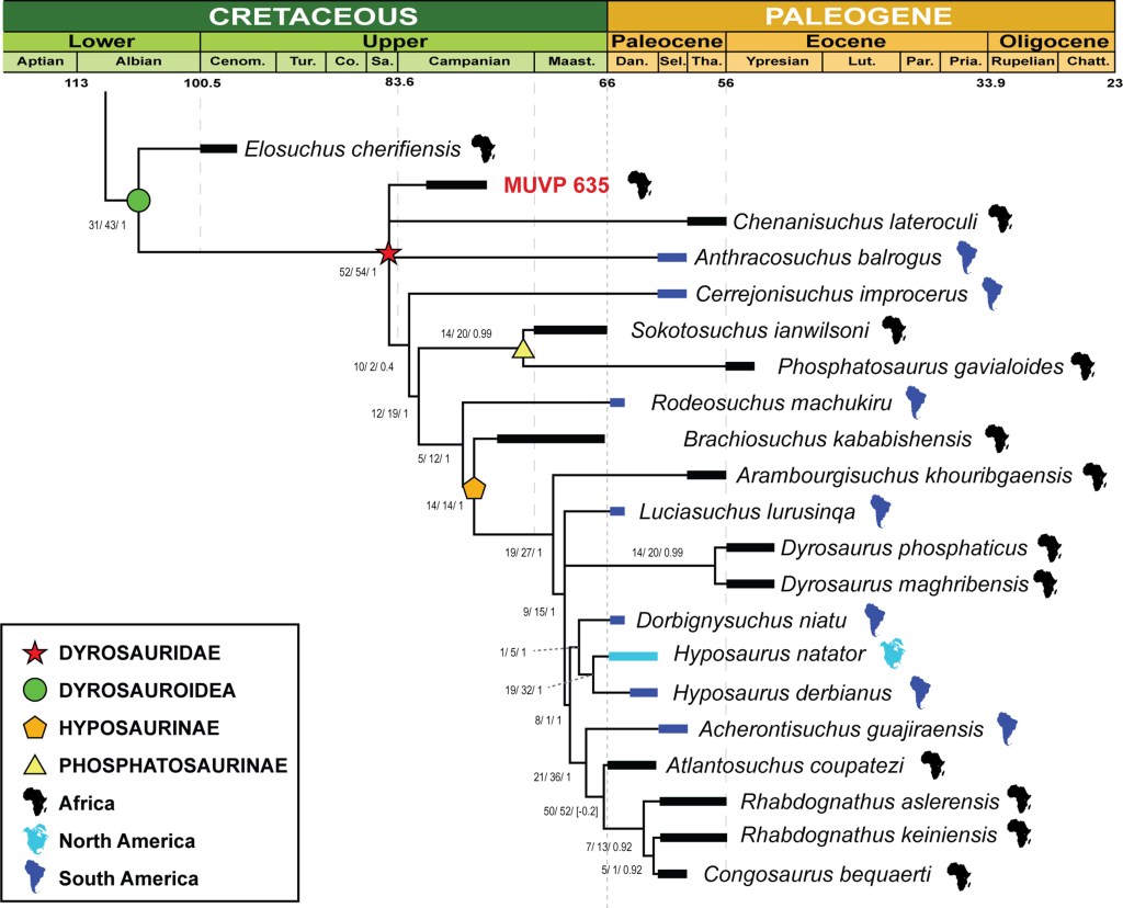 Le spécimen décrit par Saber et ses collègues est une mandibule partielle associée à deux ostéodermes partiels (MUVP 635). Ce spécimen a subi des dommages depuis sa découverte initiale car il n’a été collecté que bien plus tard. Saber et ses collègues ont réalisé une analyse phylogénétique qui place MUVP 635 comme un dyrosauridé basal proche de Chenanisuchus et Anthracosuchus. Ils notent également que Brachiosuchus est un hyposauriné basal plutôt qu’un dyrosauridé basal. Pour Saber et ses collègues, MUVP 635 représente probablement un nouveau taxon mais trop fragmentaire pour être nommé, ce qui les amène à référer MUVP 635 à Dyrosauridae indet.