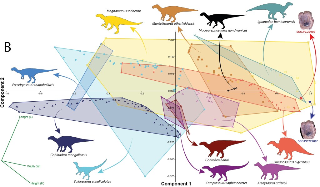 Le spécimen redécrit par Alarcón-Muñoz et ses collègues est un centrum caudal partiel (SGO.PV.22900). Par des observations et des comparaisons, ils déterminent que la vertèbre SGO.PV.22900 appartient à un ornithopode iguanodontien. L’analyse morphométrique d’Alarcón-Muñoz et ses collègues place SGO.PV.22900 proche des morphospaces d’Iguanodon et de Magnamanus. La nature isolée et partielle de SGO.PV.22900 ne permet pas de l’attribuer à un taxon ou un groupe spécifique, bien qu’il s’agisse probablement d’un nouveau taxon. Alarcón-Muñoz et ses collègues réfèrent SGO.PV.22900 à Iguanodontia indet. en notant qu’il s’agit d’un iguanodontien non-hadrosauroidé.