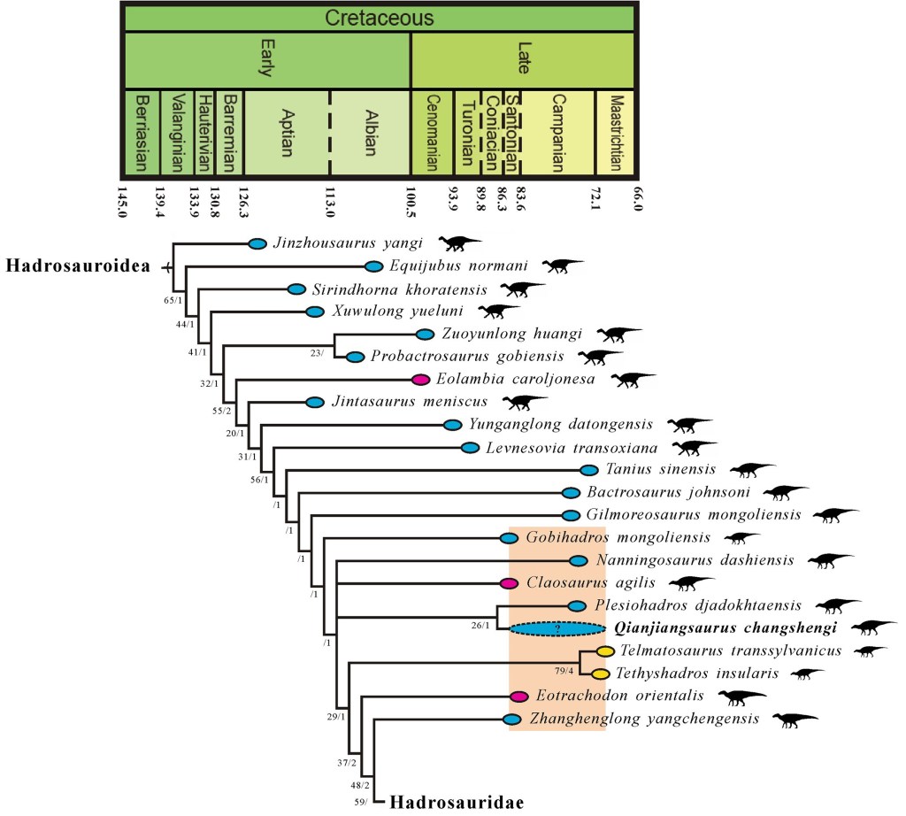Référence : Dai, H.; Ma, Q.; Xiong, C.; Lin, Y.; Zeng, H.; Tan, C.; Wang, J.; Zhang, Y.; Xing, H., 2024, A new late-diverging non-hadrosaurid hadrosauroid (Dinosauria: Ornithopoda) from southwest China: support for interchange of dinosaur faunas across East Asia during the Late Cretaceous. Cretaceous Research. 105995.
