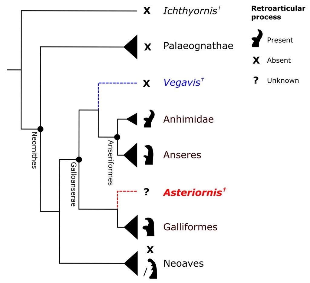 L’analyse phylogénétique de Crane et ses collègues classe Asteriornis comme un Pan-Galliformes chez les Galloanserae. Cette position est soutenue par plusieurs caractères qui ne dépendent pas du processus rétroarticulaire. De plus, Crane et ses collègues notent que Vegavis (et plus généralement Vegaviidae) se place à la base des Pan-Anseriformes, mais que cette famille ne possède pas de processus rétroarticulaire. Ils en concluent qu’Asteriornis est bien un membre de Pan-Galloanserae, potentiellement un Pan-Galliformes, et que cette position ne dépend pas de la présence ou non d’un processus rétroarticulaire.