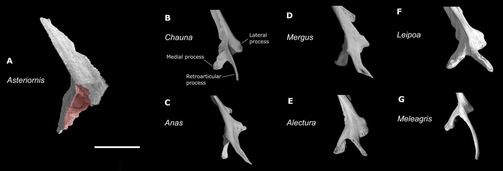 Asteriornis est un oiseau néornithe Pan-Galloanserae décrit en 2020 par Field et ses collègues, avec A. maastrichtensis pour espèce. Il est connu d’un spécimen composé du crâne presque complet et d’éléments des membres (NHMM 2013 008) découvert dans le Maastrichtien de la formation géologique de Maastricht (Limbourg, Belgique). L’une des caractéristiques permettant de classer Asteriornis comme un Pan-Galloanserae est la présence d’un processus rétroarticulaire sur sa mandibule, mais sa présence a été remise en doute, ce qui a fragilisé le classement d’Asteriornis. Crane et ses collègues analysent ainsi en détail la mandibule d’Asteriornis pour déterminer s’il présente ou non un processus rétroarticulaire.