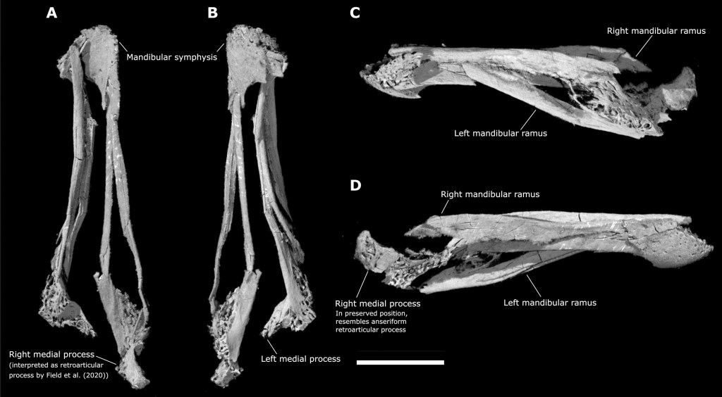 Références : Crane, A.; Benito, J.; Chen, A.; Musser, G.; Torres, C.R.; Clarke, J.A.; Lautenschlager, S.; Ksepka, D.T.; Field, D.J., 2024, Taphonomic damage obfuscates interpretation of the retroarticular region of the Asteriornis mandible. Geobios.