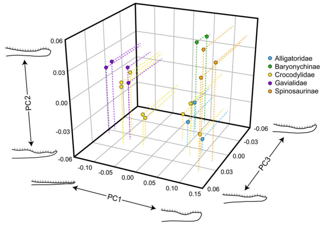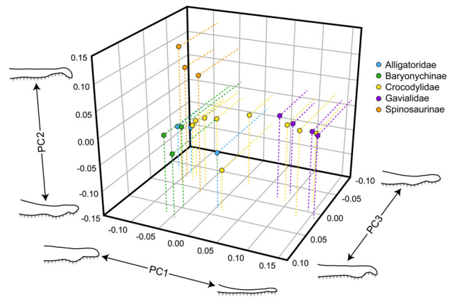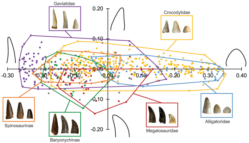 D’Amore et ses collègues ont tout d’abord réalisé plusieurs analyses morphométriques pour comparer la forme des dents et des mâchoires des différents spinosauridés avec les crocodiliens actuels. Ils constatent que les dents coniques des spinosaurinés sont droites à légèrement courbées et que celles des baryonychinés ont la même morphologie, mais qu’elles sont parfois plus courbées. Tous les spinosauridés partagent une morphologie dentaire conique avec une surface cannelée dépourvue de serrations.