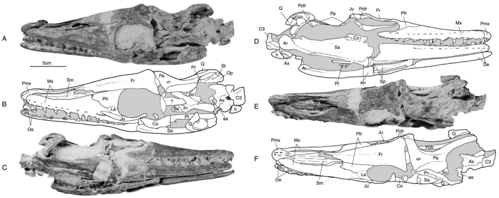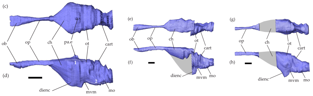 Allemand et ses collègues ont scanné les crânes de l’holotype (MNHN GOU 1) et des spécimens référés SMU 76335 et SMU 75486 de Tethysaurus nopcsai. A noter que SMU 76335 n’a jamais été mentionné dans la littérature scientifique jusque là, mais n’a pas été décrit ni illustré par Allemand et ses collègues. Sur la base de ce scan, Allemand et ses collègues ont réalisé une modélisation 3D de l’endocrâne de T. nopcsai. A partir de cet endocrâne, il leur a été possible d’estimer la morphologie de certaines structures cérébrales de Tethysaurus.