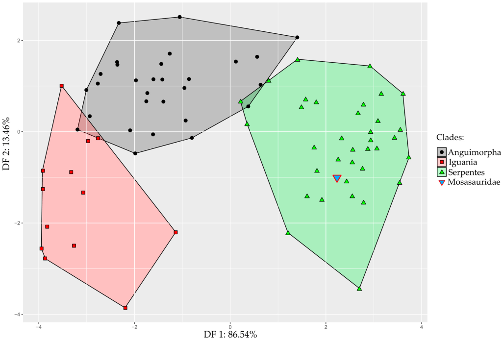 Une fois l’endocrâne de Tethysaurus reconstitué, Allemand et ses collègues l’ont ensuite comparé aux endocrânes de plusieurs squamates actuels ainsi qu’aux mosasauridés Clidastes et Platecarpus. L’analyse morphométrique d’Allemand et ses collègues place Tethysaurus dans le morphospace des serpents actuels. Ils notent que la forme de l’endocrâne possède un fort signal phylogénétique chez les squamates. Par conséquent, ce résultat confirme la monophylie de Pythonomorpha, à savoir la relation de groupe-soeur entre Mosasauroidea et Ophidiomorpha.
