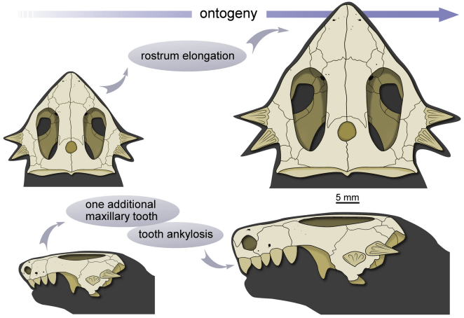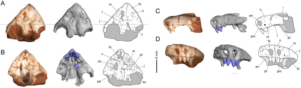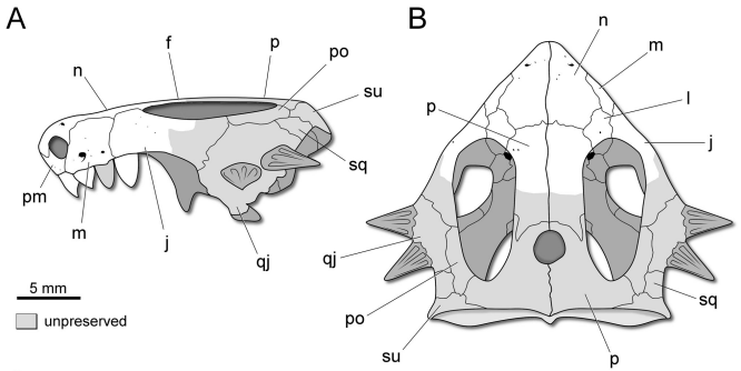 Références : Dalle Laste, V.Z.; Cisneros, J.C.; Doering, M.; Kerber, L.; Müller, R.T., 2024, A skeletally immature specimen provides new information on the cranial osteology and intraspecific variation of Soturnia caliodon (Procolophonidae: Leptopleuroninae), Upper Triassic of Southern Brazil. Journal of Systematic Palaeontology. 22(1): 2388166.