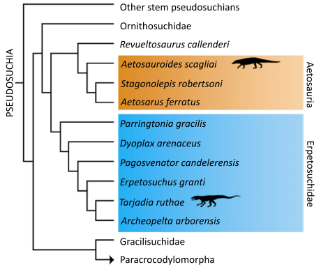 Aetosauroides est un genre d’archosauromorphe aetosaure basal connu de plusieurs espèces, y compris A. scagliai du Carnien de la formation géologique d’Ischigualasto (La Rioja, Argentine). Tarjadia est un archosauromorphe erpetosuchidé connu d’une seule espèce, T. ruthae, du Ladinien-Carnien de la formation géologique de Chañares (La Rioja, Argentine). Aetosauroides et Tarjadia sont des pseudosuchiens, un groupe qui comprend notamment les crocodiliens actuels. Hormis chez les crocodylomorphes, les pathologies des pseudosuchiens sont encore très peu connues. Ponce et ses collègues analysent ainsi les paléopathologies affectant Tarjadia et Aetosauroides.