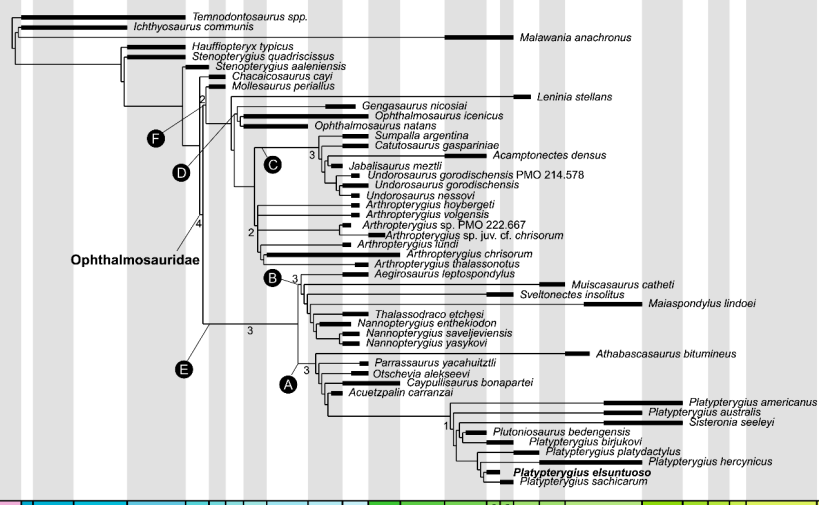 L’analyse phylogénétique de Páramo-Fonseca et ses collègues classe Platypterygius elsuntuoso en espèce-soeur de P. sachicarum, dans une position dérivée au sein du genre Platypterygius. Cette analyse retrouve Platypterygius comme un genre monophylétique, contrairement à la plupart des études récentes (voir par exemple cet article). Páramo-Fonseca et ses collègues considèrent que P. sachicarum (= Kyhytysuka) et P. birjukovi (= Simbirskiasaurus) sont des espèces de Platypterygius. Bien que leur analyse place Sisteronia et Plutoniosaurus au sein du genre Platypterygius, Páramo-Fonseca et ses collègues imputent ces résultats au manque de données pour ces taxons.