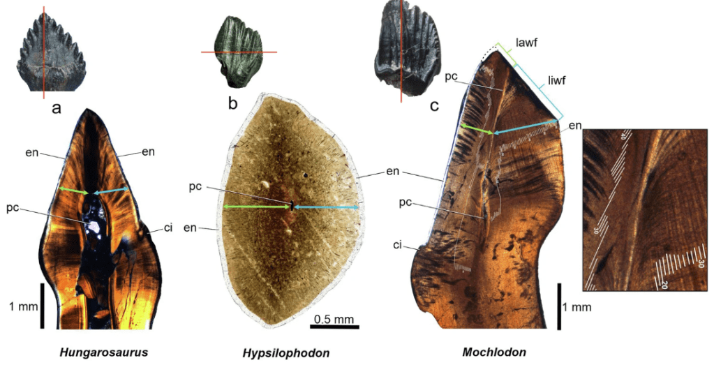 Références : Ősi, A.; Barrett, P. M.; Nagy, A. L.; Szenti, I.; Vásárhelyi, L.; Magyar, J.; Segesdi, M.; Csiki-Sava, Z.; Botfalvai, G.; Jó, V., 2024). « Trophic evolution in ornithopod dinosaurs revealed by dental wear ». Nature Communications. 15 (1). 7330.