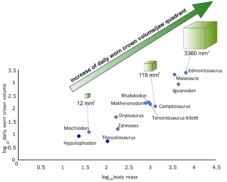 Le nombre de dents des ornithopodes basaux (rhabdodontomorphes, elasmariens et dryosauridés) est relativement constant au cours de leur évolution. Bien que ce nombre est constant, la taille relative des dents augmente chez les taxons plus grands (Tenontosaurus et Zalmoxes par exemple). Chez les ankylopollexiens, le nombre et la taille des dents augmentent jusqu’à l’apparition des hadrosauridés. La taille des dents des hadrosauridés n’augmente pas mais le nombre de leur dents augmente beaucoup. Ősi et ses collègues remarquent une tendance évolutive chez les ornithopodes, où ces augmentations de taille et de nombre des dents permettent un accroissement de la surface dentaire de plus en plus important, avec des valeurs maximales chez les hadrosauridés.