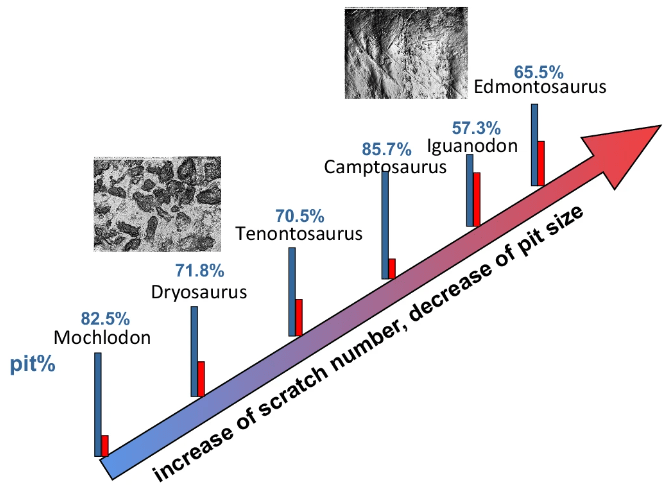 Au niveau microscopique, la micro-usure dentaire des ornithopodes a également évolué au cours de leur évolution. Cette évolution a récemment été traitée en détail par Kubo et ses collègues (voir cet article). Ősi et ses collègues abordent la micro-usure dentaire avec une approche différente puisqu’ils comparent la quantité de fosses et de rayures en plus de comparer leur taille. Au cours de l’évolution des ornithopodes, leur micro-usure dentaire voit le nombre de rayures augmenter et le nombre de fosses diminuer, tandis que la taille des rayures et des fosses augmente.