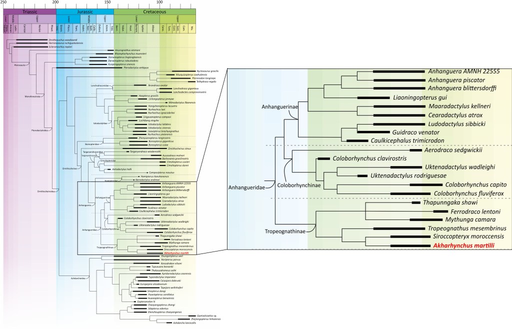 Il y a quelques années, l’extrémité d’une mâchoire supérieure de ptérosaure fut découverte dans le Cénomanien de la formation géologique de Kem Kem (Drâa-Tafilalet, Maroc). Bien qu’une dizaine de ptérosaures sont déjà connus de cette formation, il semble s’agir d’un nouveau taxon. Jacobs et ses collègues le décrivent sous le nom d’Akharhynchus (« un autre museau », en référence au grand nombre de ptérosaures connus dans la formation géologique de Kem Kem), avec A. martilli pour espèce.