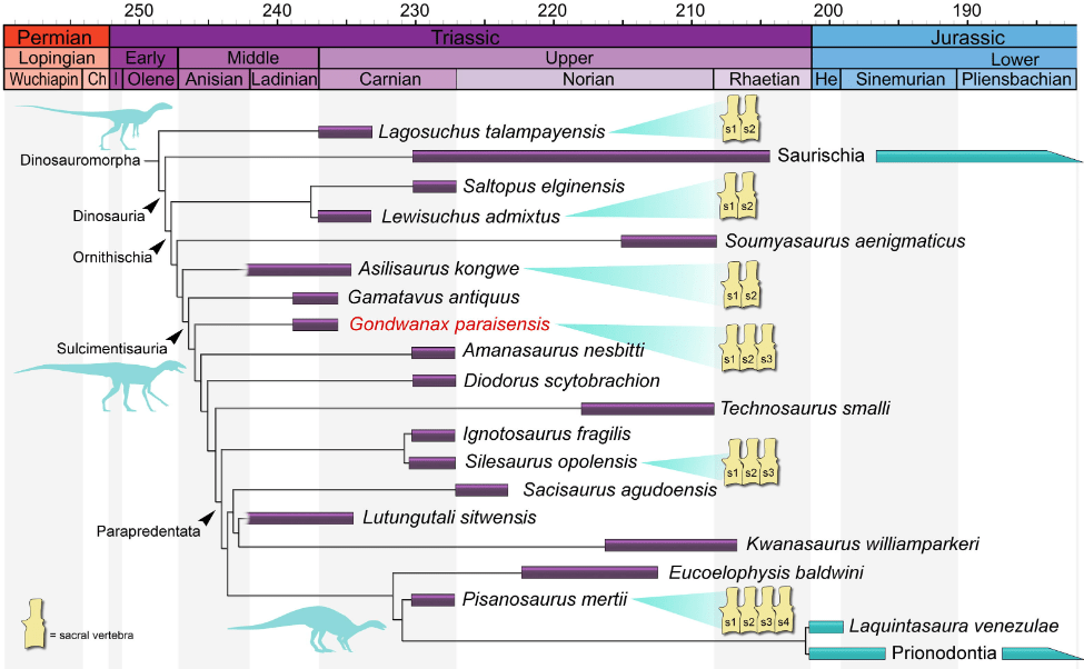 Gondwanax représente le silesauridé le plus basal présentant 3 vertèbres sacrales. Au sein de Silesauridae, la condition ancestrale est la présence de 2 vertèbres sacrales. Les sulcimentisauriens dérivés possèdent 3 vertèbres sacrales et Pisanosaurus en possède même 4. La présence de 3 vertèbres sacrales chez Gondwanax laisse penser que ce trait était peut-être ancestral à Sulcimentisauria, étant donné qu’Asilisaurus (le taxon-soeur de Sulcimentisauria) n’en possède que 2. Cette augmentation du nombre de vertèbres sacrales a pu permettre une meilleure adaptation à la quadrupédie.