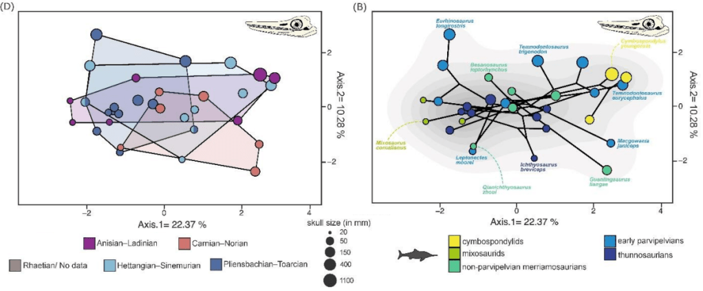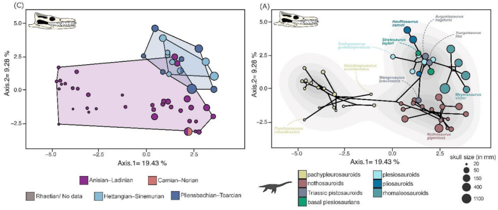 Laboury et ses collègues ont étudié un ensemble de données comprenant plusieurs centaines de spécimens du trias moyen-supérieur et du jurassique inférieur. A noter qu’ils n’ont étudié que les sauropterygiens dérivés (les eosauropterygiens), excluant ainsi les saurosphargiformes et les placodontes de leur étude. Laboury et ses collègues ont réalisé des analyses morphospatiales en fonction de la phylogénie mais aussi en fonction de l’âge des spécimens.