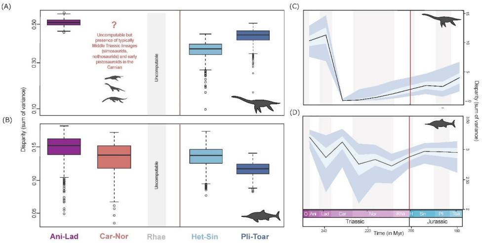 Laboury et ses collègues notent que le pic de disparité des eosauropterygiens et des ichthyosauromorphes se trouve au trias moyen. A la fin du trias moyen, plusieurs familles de ces groupes disparaissent, ne laissant place qu’aux ichthyosaures merriamosauriens et diminuant drastiquement le nombre de pachypleurosaures et de nothosauroïdés. Suite à cette disparition, les eosauropterygiens et les ichthyosauromorphes se diversifient à nouveau, ce qui entraîne l’avènement des simosauridés ou des shastasauridés. A la limite trias-jurassique, plusieurs familles disparaissent et ne persistent que les pistosauroidés et les ichthyosaures parvipelviens.