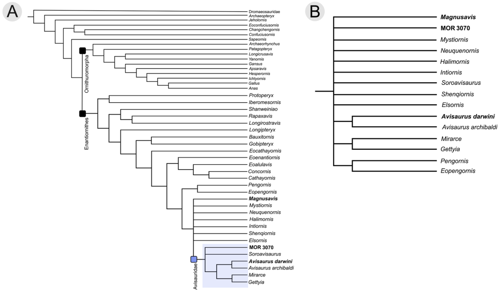 Le spécimen décrit par Clark et ses collègues est un tarsométatarsien droit partiel (MOR 3070) associé à des fragments non identifiés. La morphologie de ce spécimen est typique des énantiornithes avisauridés, et se rapproche beaucoup de celle d’Avisaurus. L’analyse phylogénétique de Clark et ses collègues soutient le classement de MOR 3070 au sein d’Avisauridae. Toutefois, MOR 3070 présente des caractéristiques distinctives qui suggèrent qu’il s’agit d’une nouvelle espèce d’Avisaurus. La nature fragmentaire de MOR 3070 ne permet toutefois pas de nommer ce taxon. Pour cette raison, Clark et ses collègues attribuent MOR 3070 à Avisaurus sp.