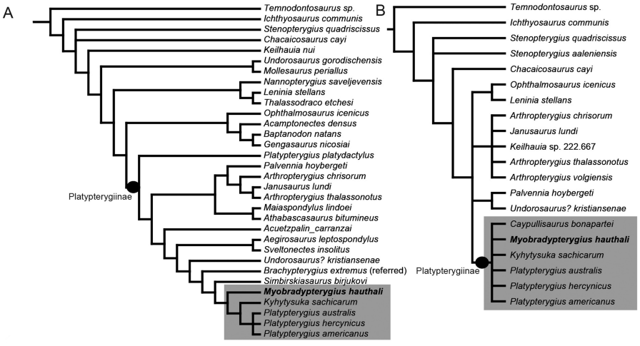 Le spécimen décrit par Pardo-Pérez et ses collègues est un squelette presque complet (TY61) préservé in situ. Ils notent qu’un projet est en cours pour excaver le spécimen TY61, qui est encore partiellement recouvert de sédiments et pris dans une matrice très solide. Les caractéristiques de TY61 correspondent à celles de M. hauthali, ce qui permet à Pardo-Pérez et ses collègues de référer ce squelette à cette espèce. Le squelette de TY61 étant presque complet, il permet de documenter plusieurs aspects jusque là inconnus de l’anatomie de Myobradypterygius. Pardo-Pérez et ses collègues réalisent ainsi une analyse phylogénétique qui confirment le classement de Myobradypterygius chez Platypterygiinae.