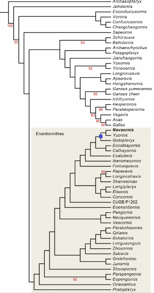 L’analyse phylogénétique de Chiappe et ses collègues classe Navaornis dans un clade avec Gobipteryx et Yuornis, en taxon-soeur de ce dernier. Bien que Chiappe et ses collègues ne le mentionnent pas, ce clade correspond à Gobipterygidae. Leurs résultats placent les gobipterygidés comme le clade-soeur des cathayornithidés. Navaornis représente donc le premier gobipterygidé découvert en Amérique du Sud.