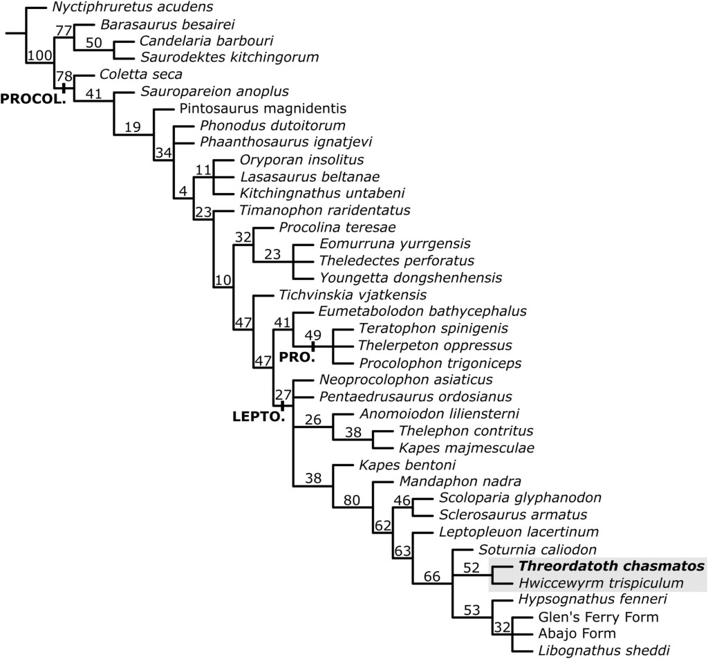 Dans les années 1970, Evans et Kemp découvrirent des restes de procolophonidés dans le dépôt d’une fissure du Carnien-Norien, dans la carrière de Cromhall (South Gloucestershire, Angleterre). En 1986, Fraser rapporte leur découverte et donnent le nom de “Cromhall procolophonid” à ces restes. En 1994, Fraser identifie deux taxons de procolophonidés présents à Cromhall, “procolophonid a” et “procolophonid b”. Meade et ses collègues décrivent ainsi le “procolophonid a” comme un nouveau genre, qu’ils baptisent Threordatoth (« dent à trois pointes »), avec T. chasmatos pour espèce.