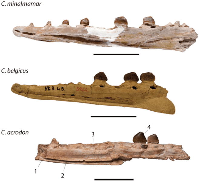 Carinodens est un genre de mosasaure mosasauridé mosasauriné connu du Maastrichtien du Brésil, des Etats-Unis, d’Angola, du Maroc, de Jordanie et d’Europe. Il est actuellement représenté par deux espèces valides : C. belgicus (l’espèce-type) et C. minalmamar, ainsi que l’espèce douteuse C. palistinicus. Longrich et ses collègues décrivent ainsi une nouvelle espèce de Carinodens, C. acrodon, connue du Maastrichtien de la formation géologique de la Couche III (Béni Mellal-Khénifra, Maroc).