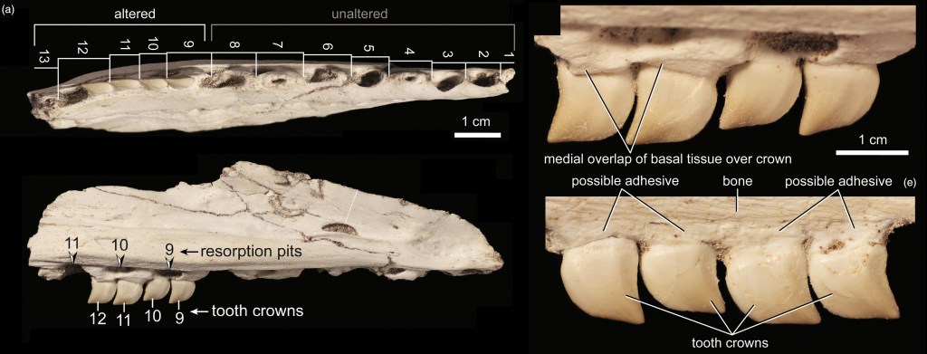 Sharpe et ses collègues avancent que les dents de MHNM.KH.331 ont été artificiellement attachées au maxillaire. En effet, les quatre dents sont présentes sur deux positions dentaires naturelles du maxillaire. De plus, une surface d’aspect légèrement différent sépare les dents du maxillaire en vue latérale, indiquant qu’il pourrait s’agir d’un matériau adhésif. L’attache artificielle des dents de MHNM.KH.331 serait donc responsable de leur orientation oblique et de leur nature resserrée.