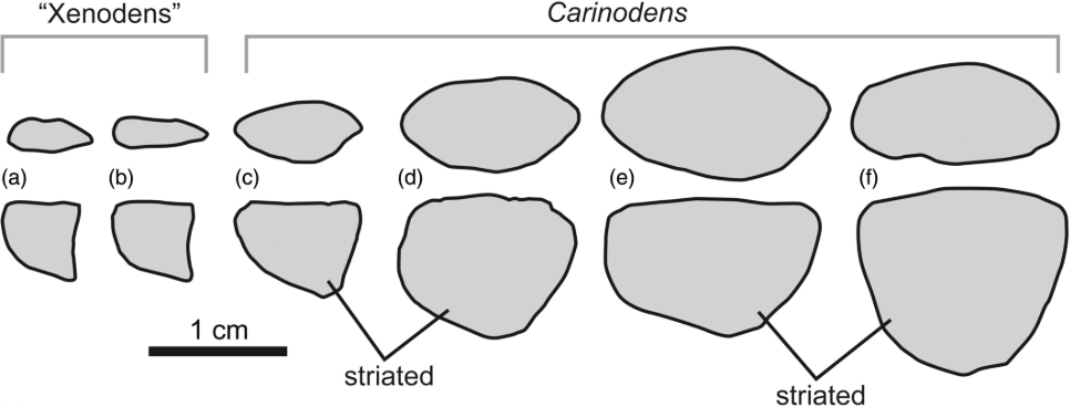 En plus de leur disposition particulière, les dents de Xenodens étaient supposées unique au sein des mosasaures selon Longrich et ses collègues. Pour Sharpe et ses collègues, les dents de Xenodens sont similaires à celles de Carinodens, mais sont plus petites, plus comprimées labiolingualement et possèdent un émail lisse. Ces trois caractéristiques sont en réalité variables au cours de l’ontogénie, et pourraient représenter le stade juvénile des dents de Carinodens.