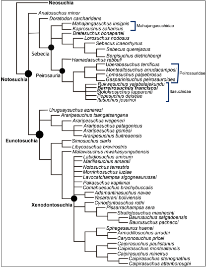 Références : Fachini, T.S.; Godoy, P.L.; Montefeltro, F.C.; Langer, M.C., 2024, Cranial morphology and phylogenetic reassessment of Barreirosuchus franciscoi (Crocodylomorpha, Notosuchia), a Peirosauria from the Late Cretaceous of Brazil. The Anatomical Record.